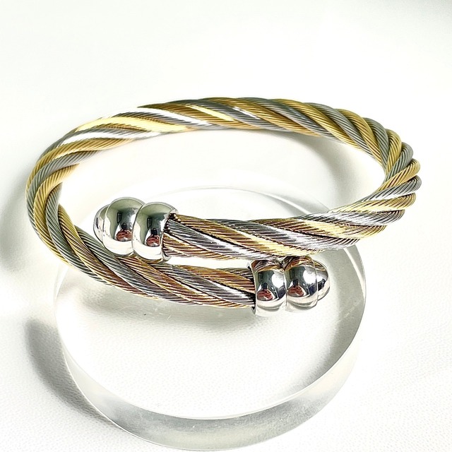 シャリオールブレス ケルティックモデル ゴールド/シルバー サイズ:S(約16cm) 定価:¥27,500- シャリオールのアイコニックなデザインであるケルトをモチーフにしたバングルです。 ステンレス製ですので、傷が付きにくく金属アレルギーにも対応しております。 サイズがS(約16cm)ですので、一般的な女性用のバングルのサイズになります。 素材:ステンレス サイズ:S(16CM) 専用BOX付属 Ref. 04-81-171.M 高級感あふれるシャリオールブレス、ゴールド/シルバーのBangle Celtic Two-tone。シンプルでエレガントなデザインが、さまざまなファッションスタイルにマッチします。 このブレスレットは技術者による手作業で生み出されました。一つ一つのデザインが異なるため、世界に一つだけのアイテムとも言えます。シルバーとゴールドのコントラストが美しく、着けた時の高揚感はたまりません。 このブレスレットを身に付けることで、あなたの魅力が更に引き立つでしょう。シャープなラインは、日常のファッションにも、パーティーシーンにもぴったりです。 注意:この商品は、汗や湿気、化粧品等により変色する場合がありますので、ご注意ください。