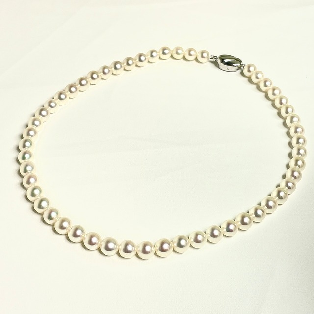 アコヤ真珠ネックレス 7.5-8.0mm N-4560 金具:シルバー 宝石:日本産アコヤ真珠(無調色) 7.5-8.0mm 重さ:38.0g 冠婚葬祭に最適なアコヤ真珠ネックレス この無調色アコヤ真珠ネックレスは、7.5mmから8.0mmの質の高い日本産アコヤ真珠を贅沢に使用しており、その美しい光沢が特徴です。 手にとった瞬間、その滑らかな質感と気品のある輝きに心を奪われることでしょう。 アコヤ真珠は、その独特の深い輝きと色合いが多くの方に親しまれています。 このネックレスは、特別な場面はもちろん、普段使いにも最適なデザインが魅力で、様々なシーンに華やかさを与えます。 本物の日本産アコヤ真珠ネックレスは、特に結婚式やお祝い事にぴったりのアイテムです。アコヤ真珠の持つエネルギーは、身につける方に自信を与え、エレガントなスタイルを演出します。 大切な方へのプレゼントにも非常に喜ばれることでしょう。 この機会に、無調色アコヤ真珠ネックレスをお手元に迎えて、特別な瞬間をお楽しみください。美しさと気品を求める方に最適なネックレスです。 ※お手入れの際は、摩擦や衝撃にご注意ください。 ※アコヤ真珠製品の取り扱いには注意が必要です。