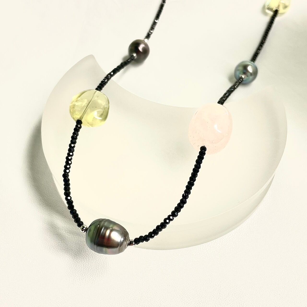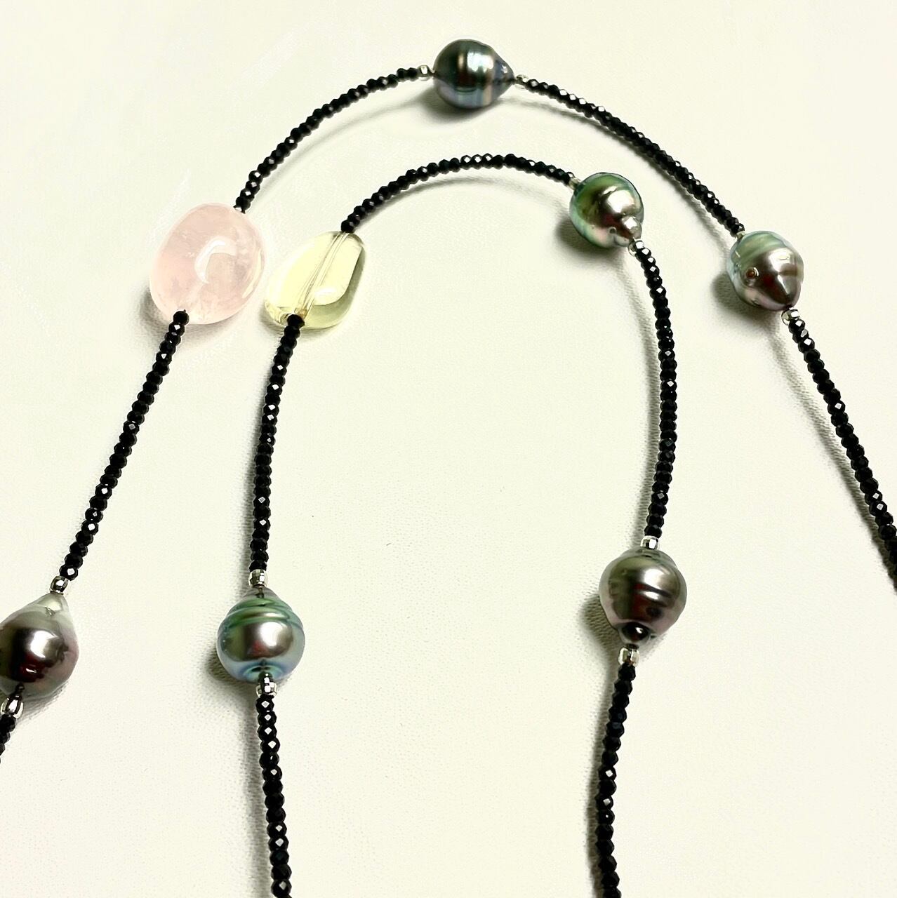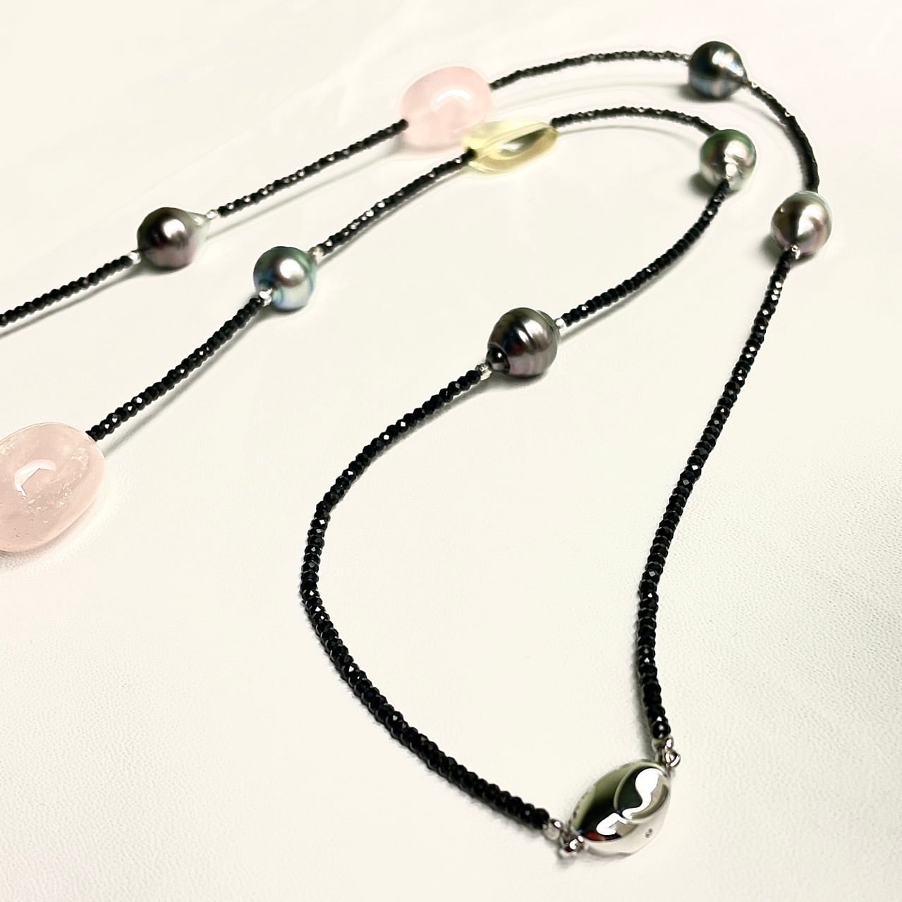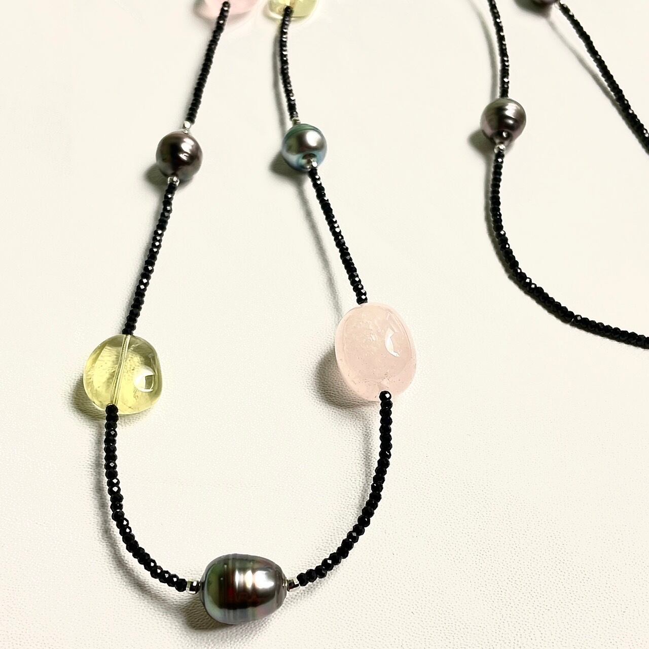 黒蝶真珠、ローズクォーツ、レモンクォーツ、ブラックスピネルを組み合わせた華やかなネックレス。個性豊かな石々が持つ色のコントラストが、60㎝の長さで美しく際立つデザインです。