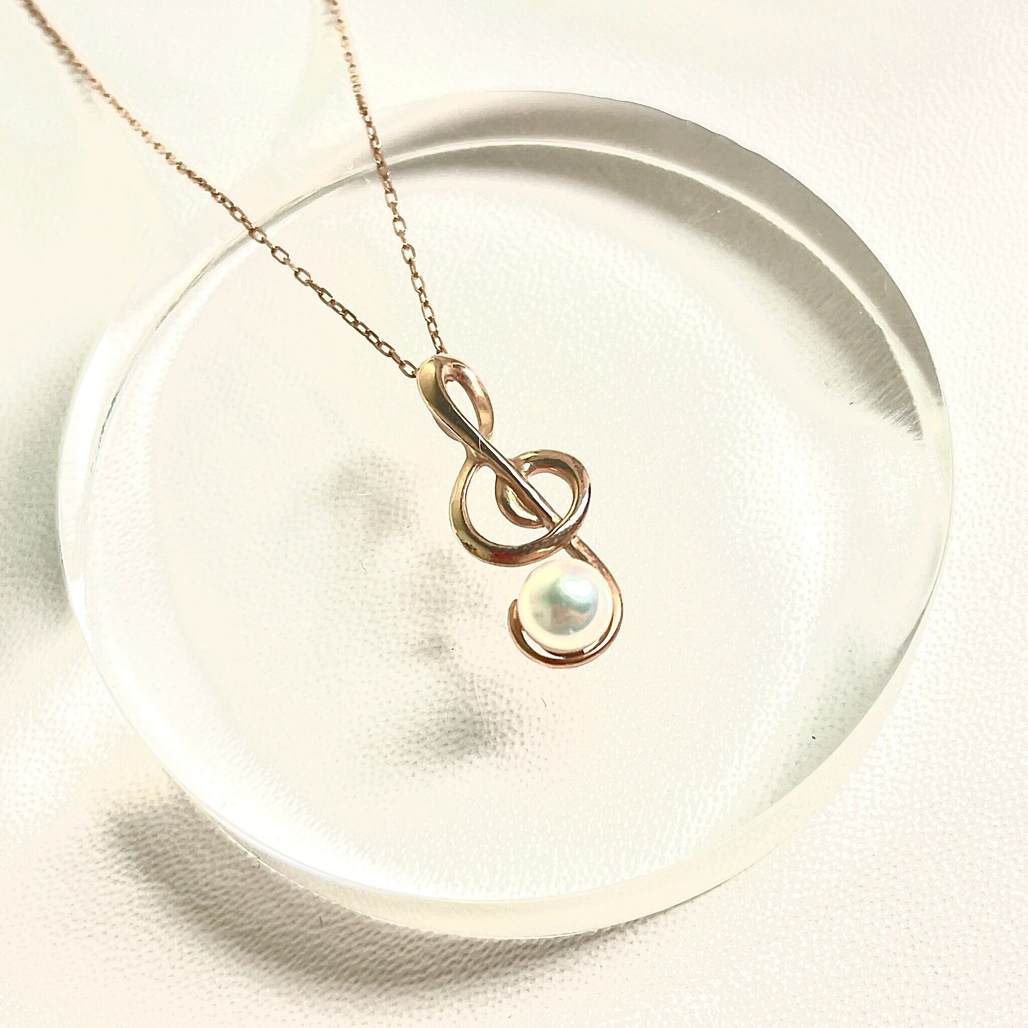 K10ピンクゴールド製の音符♪デザインに仕立てたベビーパールペンダント。