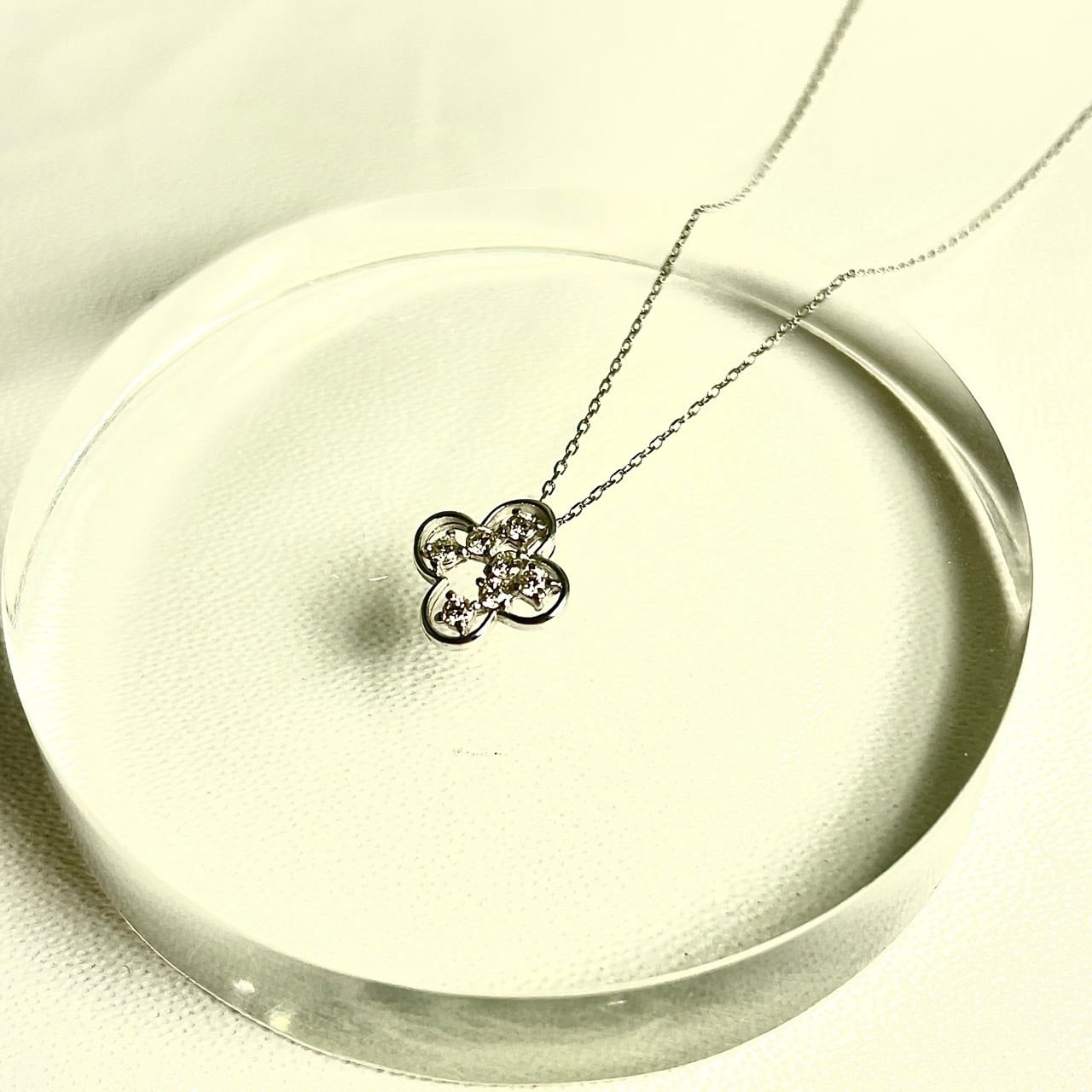 「K18ホワイトゴールド クローバーデザイン ダイヤペンダント」は、洗練されたデザインが垣間見えます。