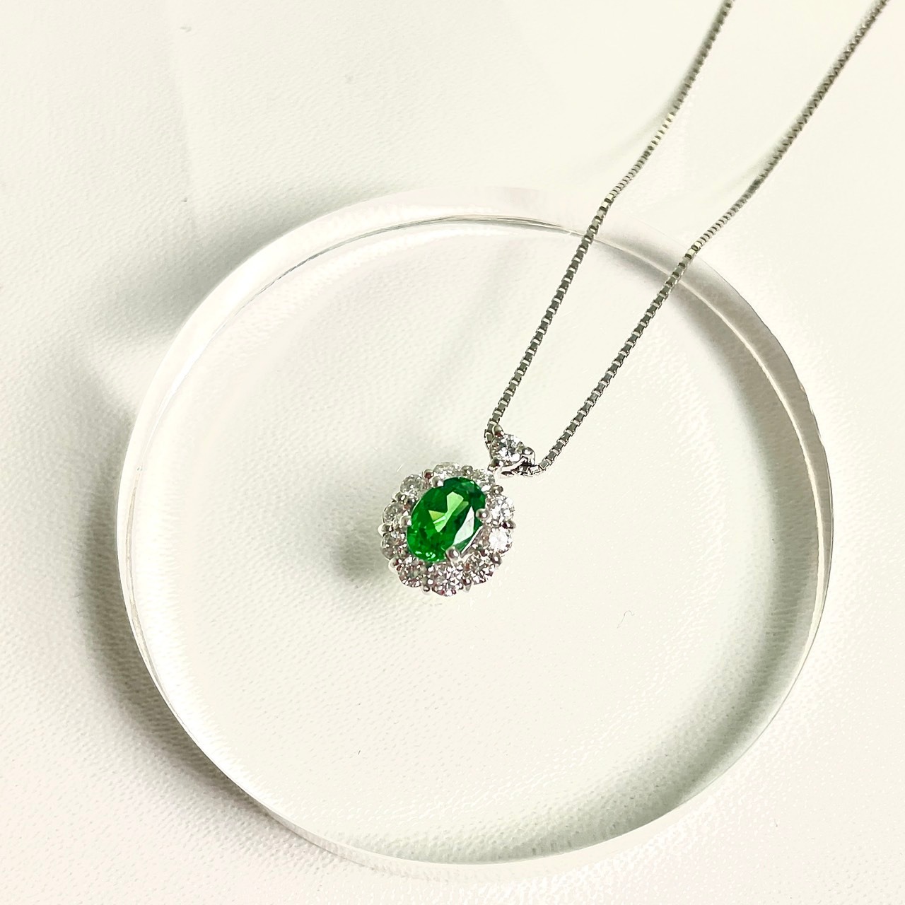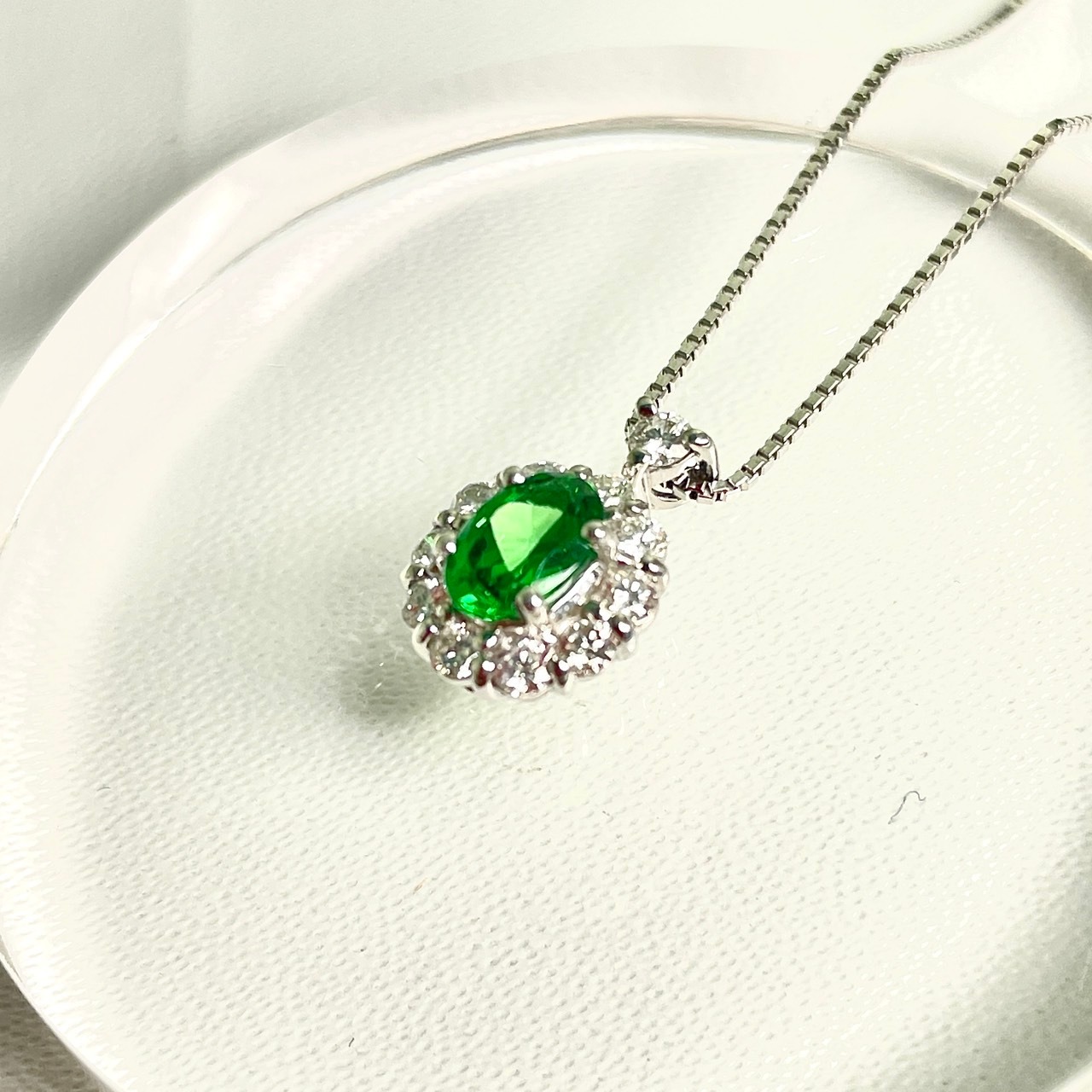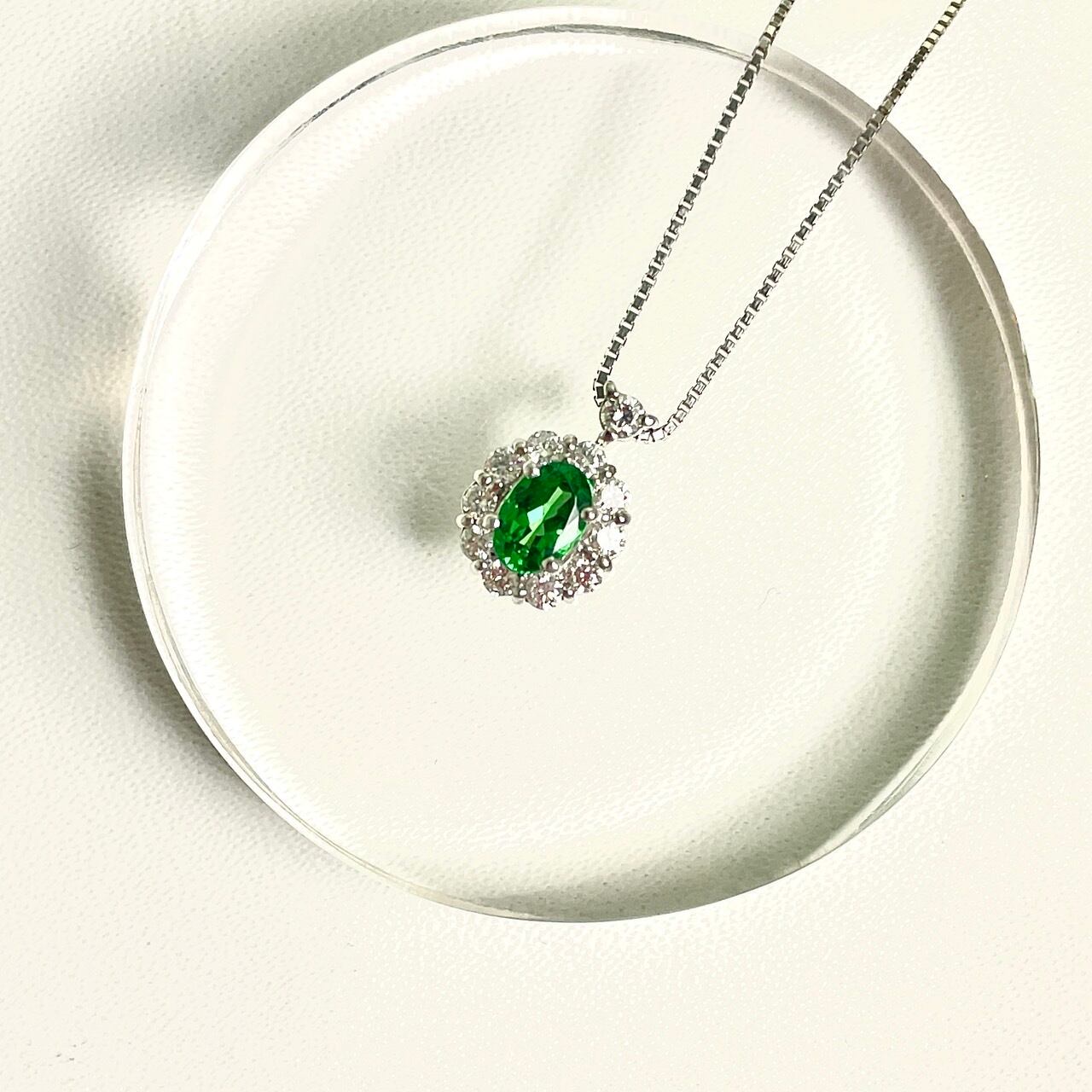 プラチナ製のペンダントに、鮮やかなグリーンガーネットをあしらったこのアイテムは、上品さと神秘的な魅力を兼ね備えています。