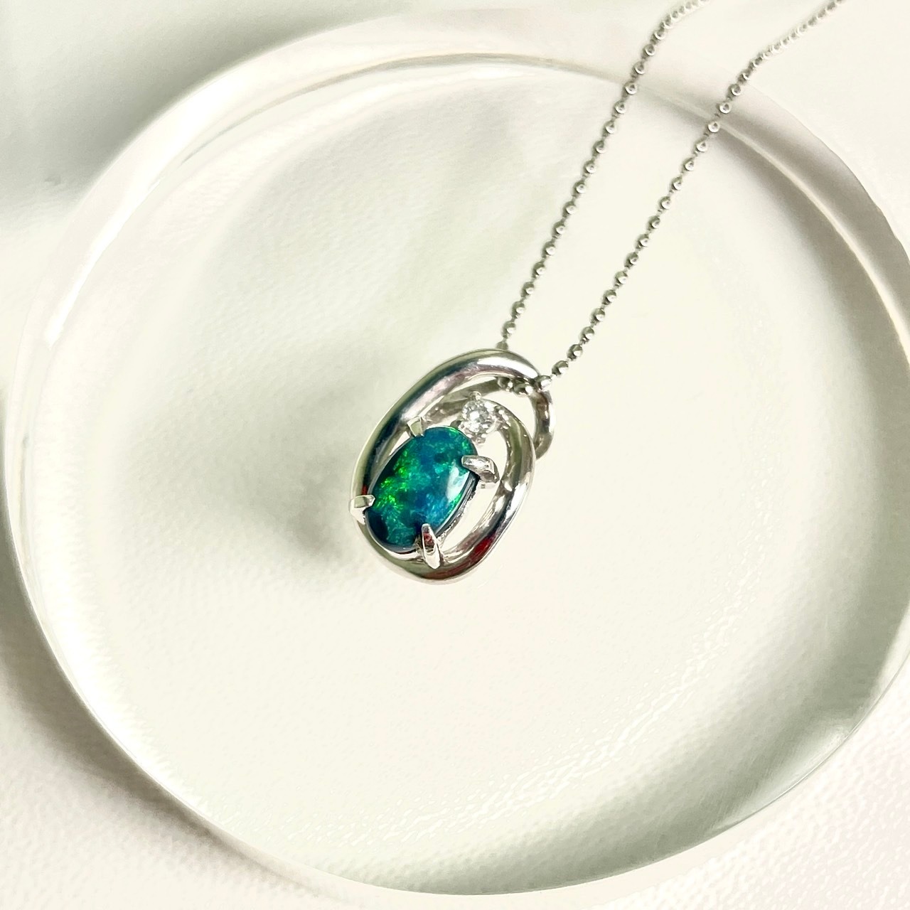 K18ホワイトゴールド製 鮮やかなブルーグリーンの発色が美しい希少な天然ブラックオパール使用 チェーンにはフリーで長さ調整が出来るK18ホワイトゴールド製チェーン使用 曲線をいかしたデザインのペンダントトップの上部とに脇石として天然ダイヤモンド0.02ct使用のカジュアルデザイン