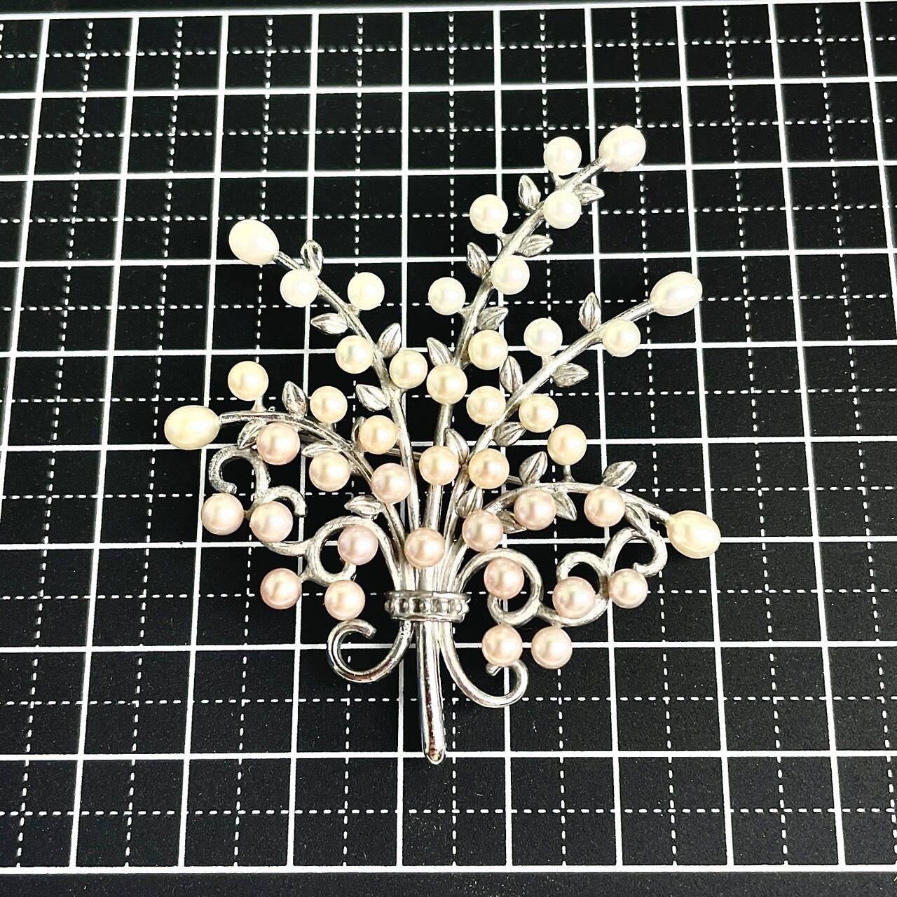 SV925製 沢山の数のベビーパールのグラデーションを活かした華やかなフラワーブーケデザインブローチ 6cmX5cmのボリュームのアルデザイン
