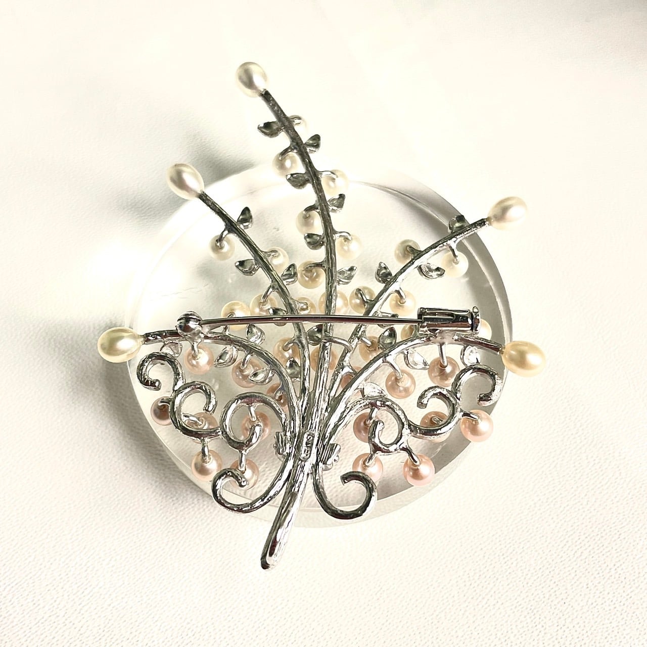 SV925製のブローチには、繊細なデザインとともに、優しい色合いの淡水ベビーパールが華を添えています。