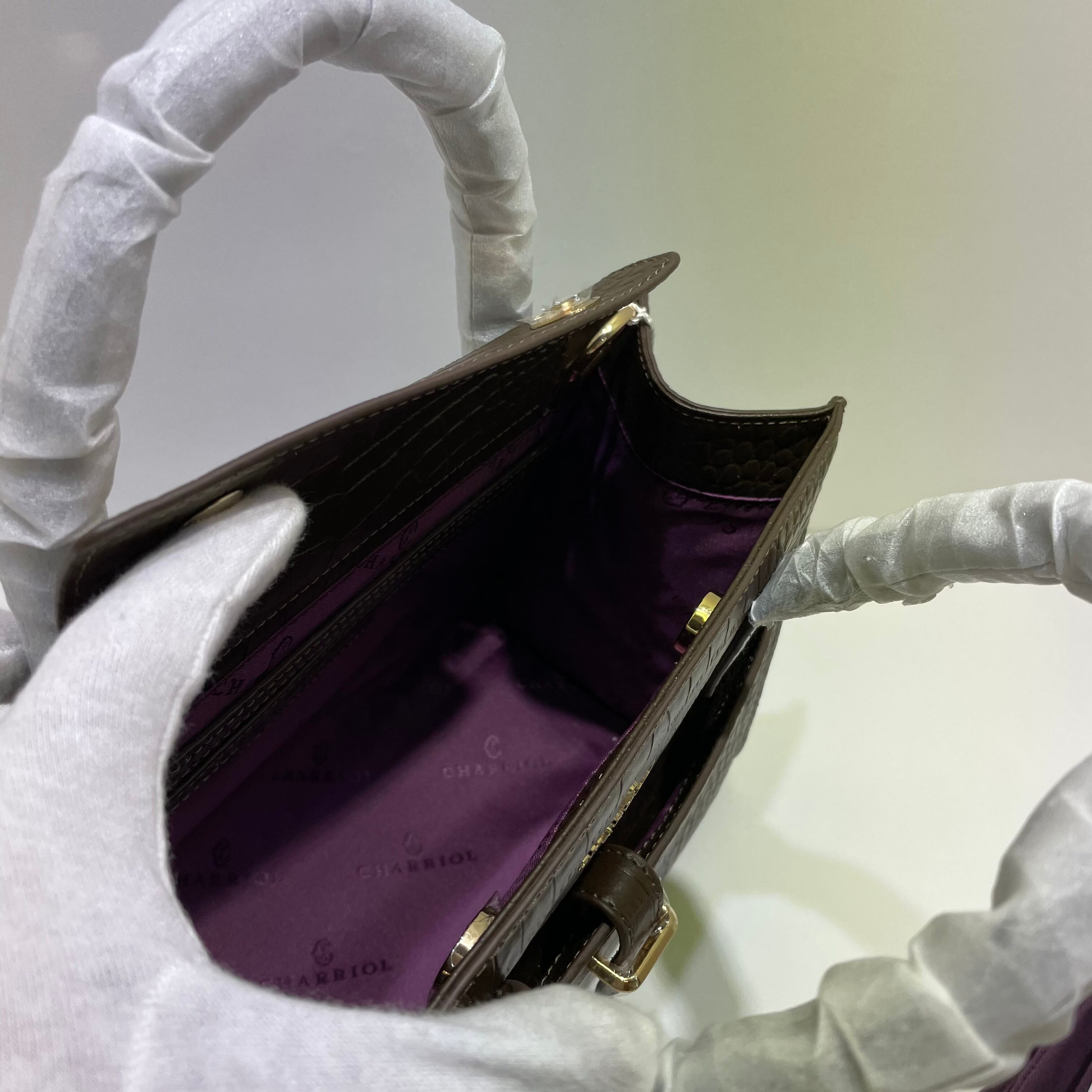 ご覧いただきありがとうございます。シャリオールバッグをご紹介します。高級感あふれるダークブラウンのレザー素材が、大人の女性にふさわしい上品な雰囲気を演出します。シンプルなデザインながら、中にはしっかりと荷物が収まる機能性も備えています。使い込むほどに味が出るレザー素材があなたの毎日のコーディネートを彩ります。