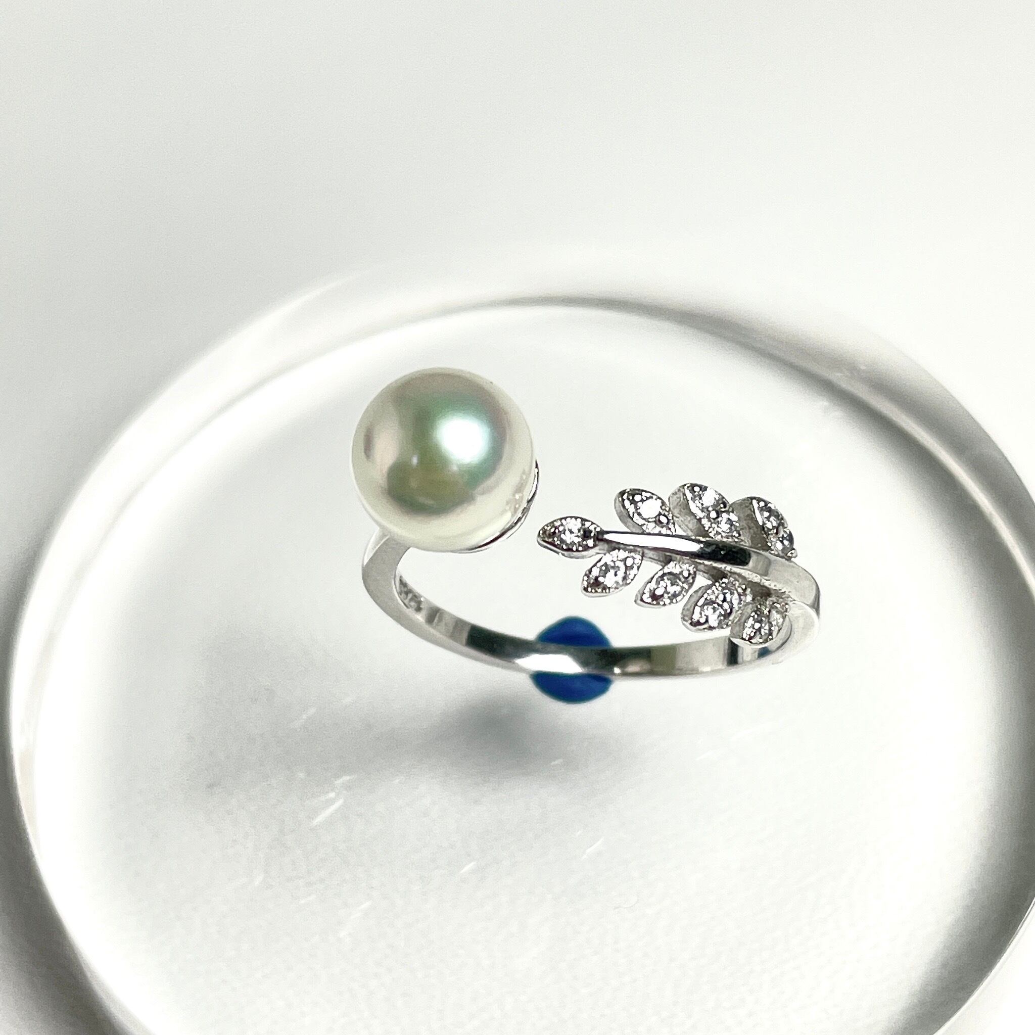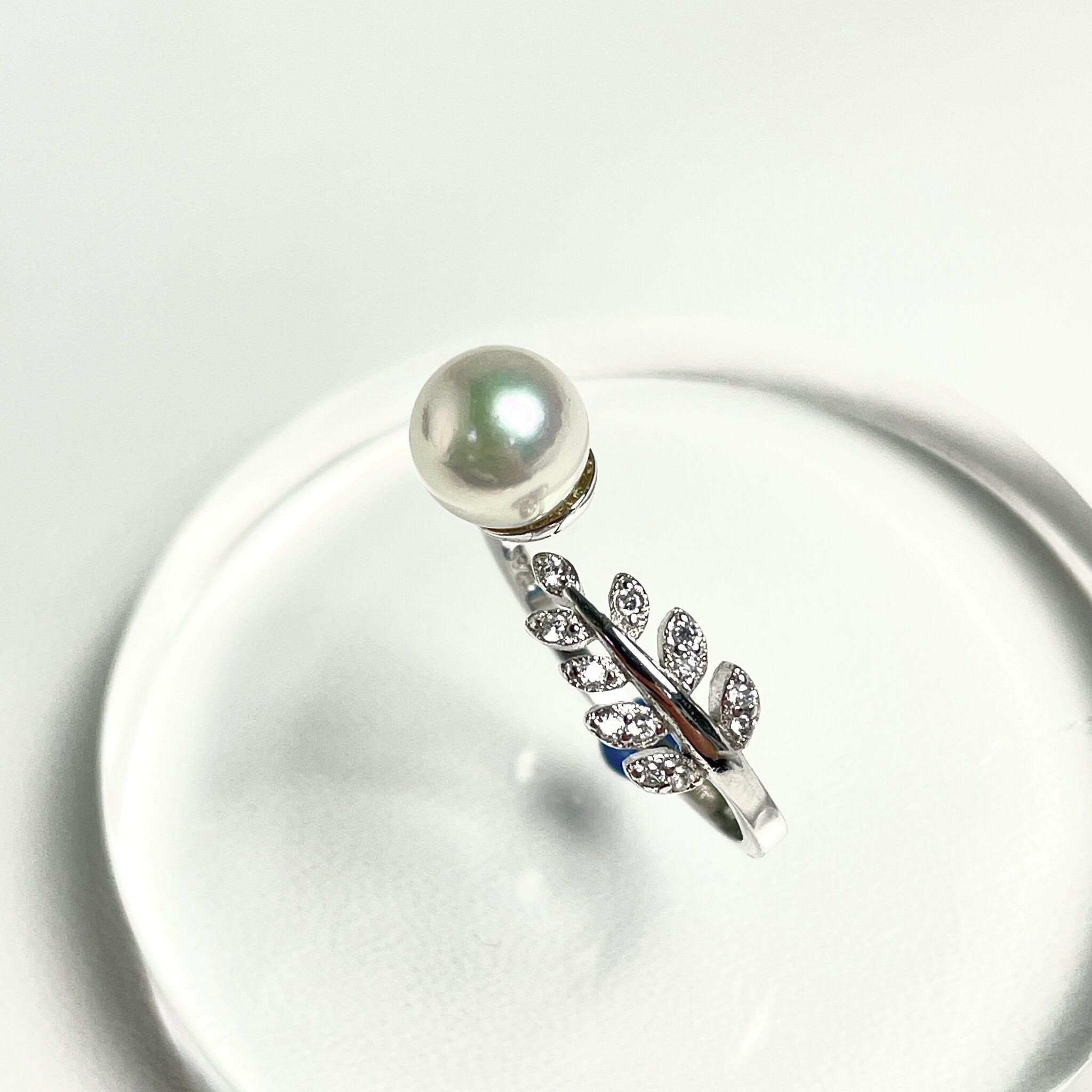 美しい光沢を放つアコヤ真珠をシルバーの台座に優雅に留めたリングです。サイズフリーで、指輪のサイズに悩まなくてもOK。