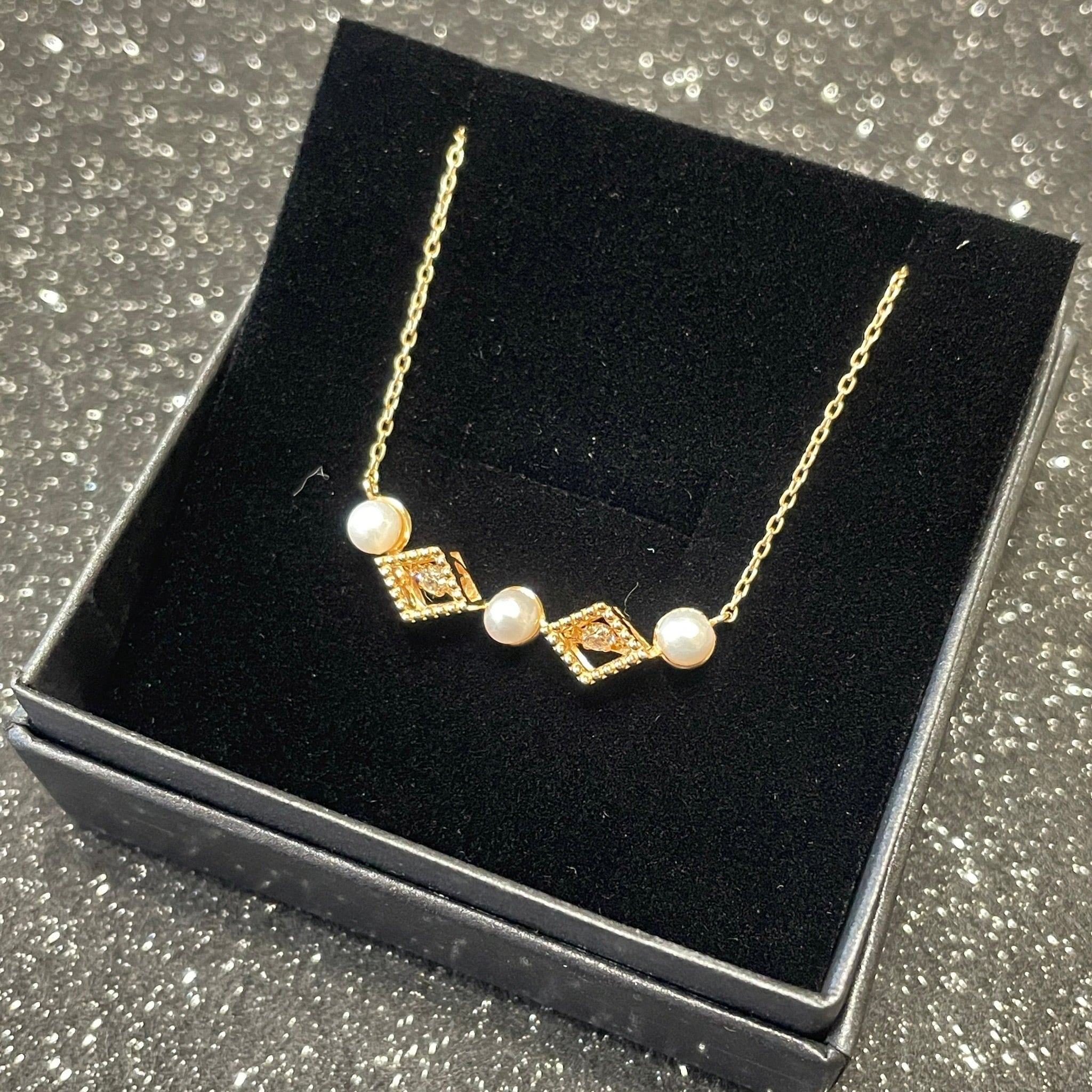 クロスフォーパールコレクションのスクエアパールネックレスです。上品でエレガントなデザインが、華やかさを引き立てます。パールは高品質で、光沢感が美しく、一粒一粒が輝きを放ちます。シンプルながらも存在感のあるデザインは、どんなシーンにも合わせやすく、オシャレなコーディネートに欠かせないアイテムです。