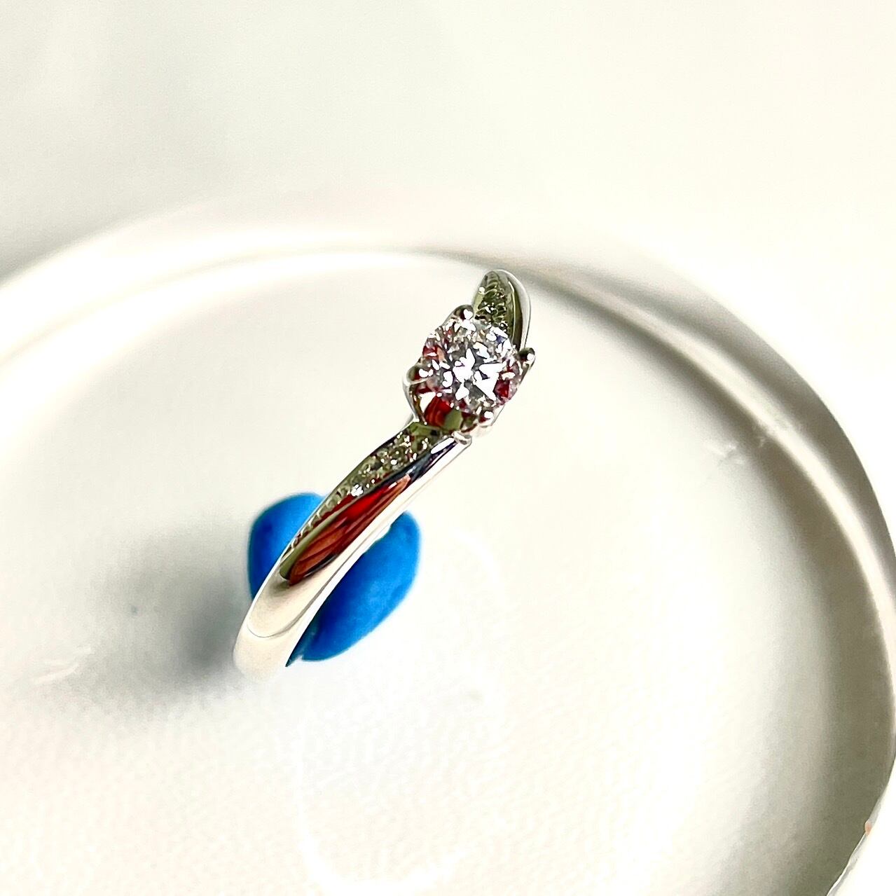 このリングは、緩やかにカーブしたVデザインと、真ん中に輝く0.217ctの高品質ダイヤモンドが特徴です。