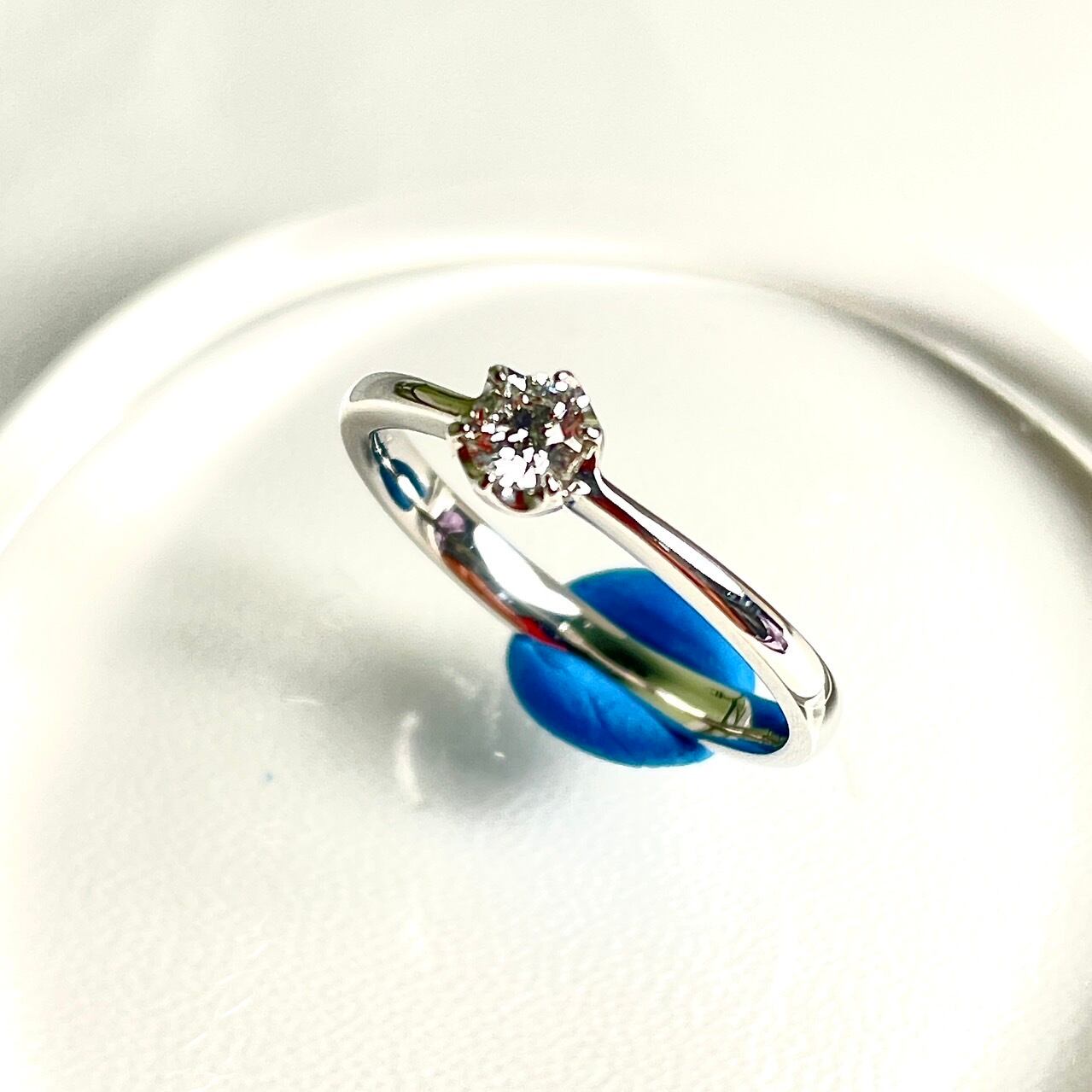 0.18ctのダイヤモンドは、Fカラー、SI1グレード、グッドカットであり、その輝きは思わず目を奪われるほど。